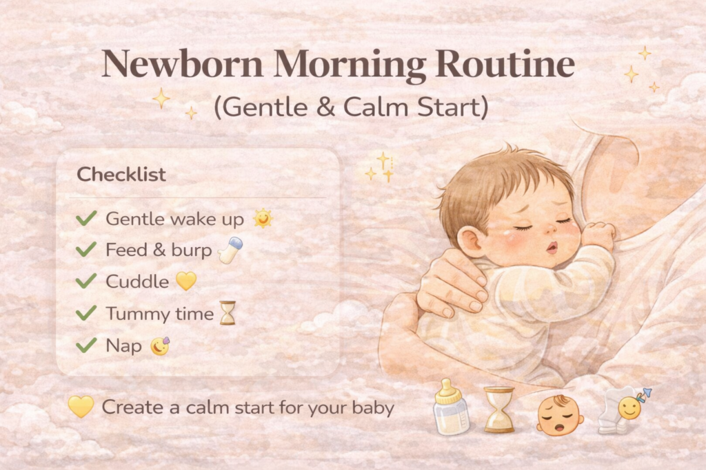 The first few hours of your babyโs day can shape the rest of the day. A calm, gentle newborn morning routine helps your baby feel secure, supports better feeding and sleep, and makes life easier for new moms too.