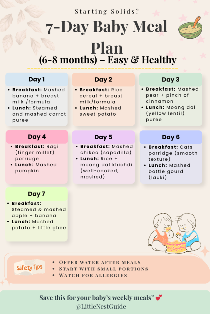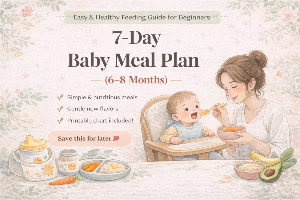 This 7-day baby meal plan for 6–8 months is designed to make feeding simple, nutritious, and stress-free. It includes easy-to-digest foods, balanced meals, and gentle combinations perfect for babies just starting solids.